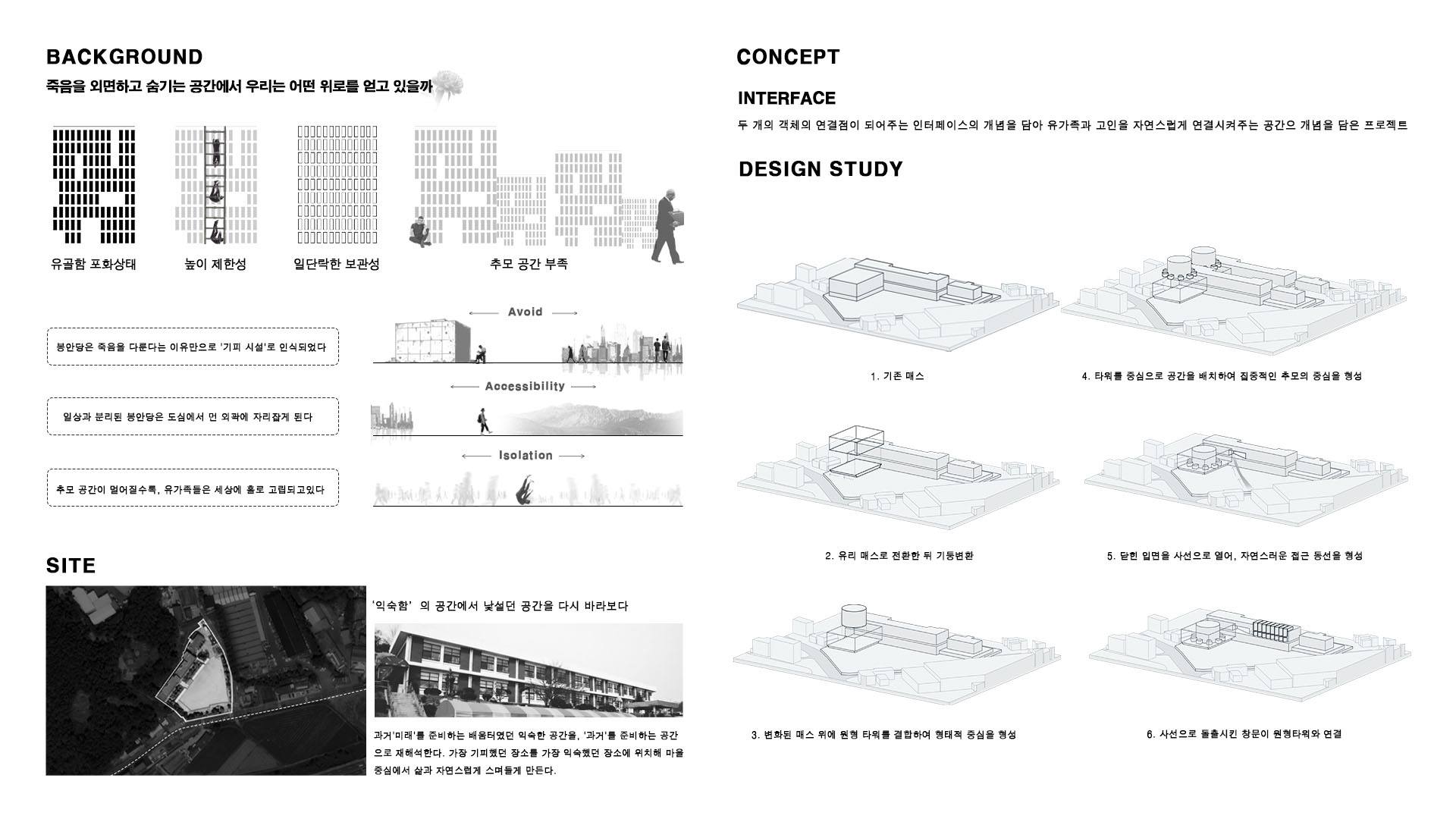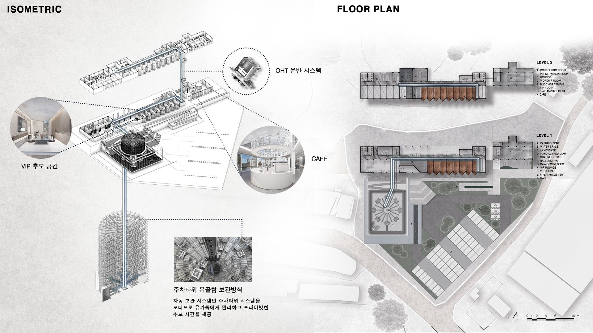 화장을 하는 추모 문화가 발전하면서 수요는 급증하지만 현실은 유골함 포화상태로 유가족들은 기댈 곳마저 사라지고 기피시설로 인식되어 점점 외곽으로 빠지며 제대로 된 추모 또한 하지 못하는 게 지금의 봉안당이다. 폐교를 선정하여 크고 자라며 배움이 있던 익숙한 공간에서 낯설기만 했던 공간을 다시 마을 중심에서 자연스럽게 스며들게 하였다. 이 작품은 보관 효율을 최대화시키고 안전하고 효율적인 보관방식을 주차타워 시스템을 모티프로 가져갔다. 키패드를 누르면 차가 앞으로 오는 시스템인 주차타워를 유골함 보관방식과 결합하여 납골타워를 형성하고 유가족들은 레일을 통해 납골타워에 보관되어 있는 고인을 프라이빗한 추모 공간에서 만날 수 있다. 레일로 유가족들과 고인, 봉안당, 지역주민 모두를 연결시켜주는 새로운 인터페이스 공간이다.
