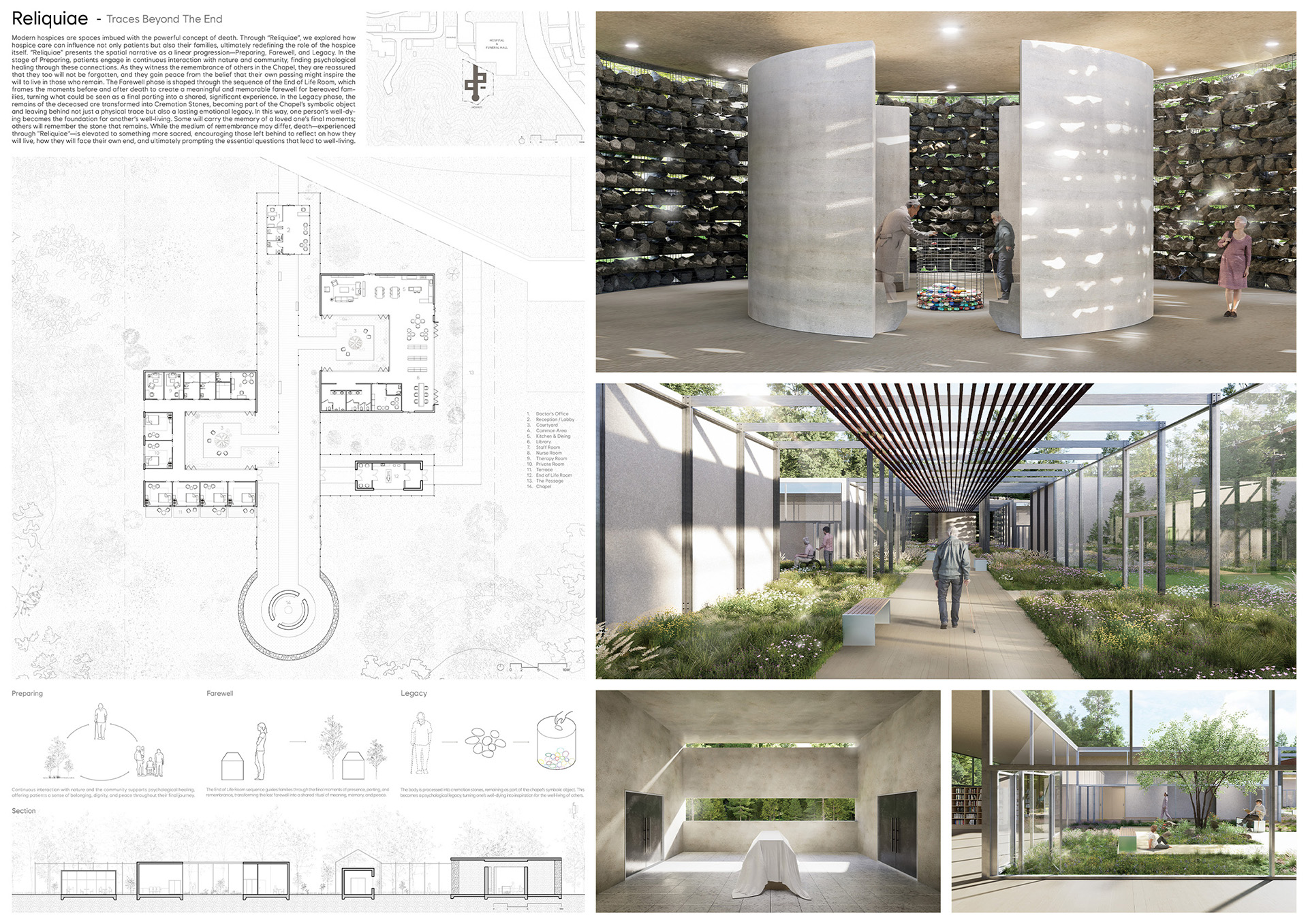 현대 호스피스는 죽음이라는 강력한 개념이 깃든 공간입니다. “Reliquiae”를 통해 우리는 호스피스 케어가 환자뿐만 아니라 그 가족에게도 어떤 영향을 미칠 수 있는지, 궁극적으로 호스피스 자체의 역할이 어떻게 재정의될 수 있는지를 탐구했습니다. “Reliquiae”는 Preparing(준비), Farewell(작별), Legacy(유산)라는 선형적 진행 과정으로 공간적 내러티브를 제시합니다. Preparing 단계에서 환자들은 자연 및 공동체와의 지속적인 상호작용에 참여하면서 이러한 연결을 통해 심리적 치유를 경험합니다. 그들은 예배당에서 타인의 추모를 목격하며 자신 또한 잊혀지지 않을 것이라는 안도감을 얻고, 자신의 죽음이 남은 이들의 삶에 영감을 줄 수 있다는 믿음에서 평안을 찾게 됩니다.